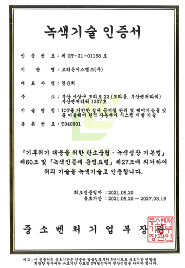 오리온시스템즈(주)는 우수조달공동상표물품 인증 및 녹색기술 인증을
